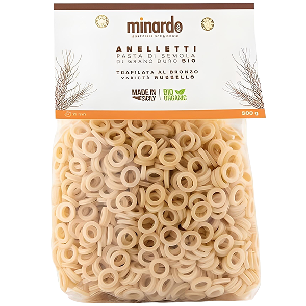 Gli Anelletti sono un formato di pasta tipico siciliano, riconosciuto per la sua forma a piccoli anelli. Sono molto utilizzati per preparare piatti tradizionali come la pasta al forno e i timballi. Realizzati con semola di grano duro biologico e acqua minerale, offrono un prodotto naturale e di alta qualità, adatto a chi cerca autenticità e gusto in cucina.