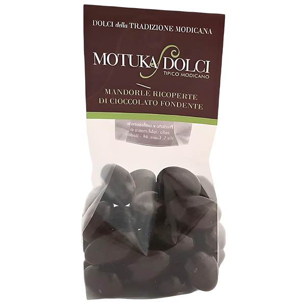 Ingredienti: Mandorle siciliane, cioccolato fondente, (zucchero, pasta di cacao, burro di cacao, vaniglia, emulsionante: lecitina di soia), gomma arabica.